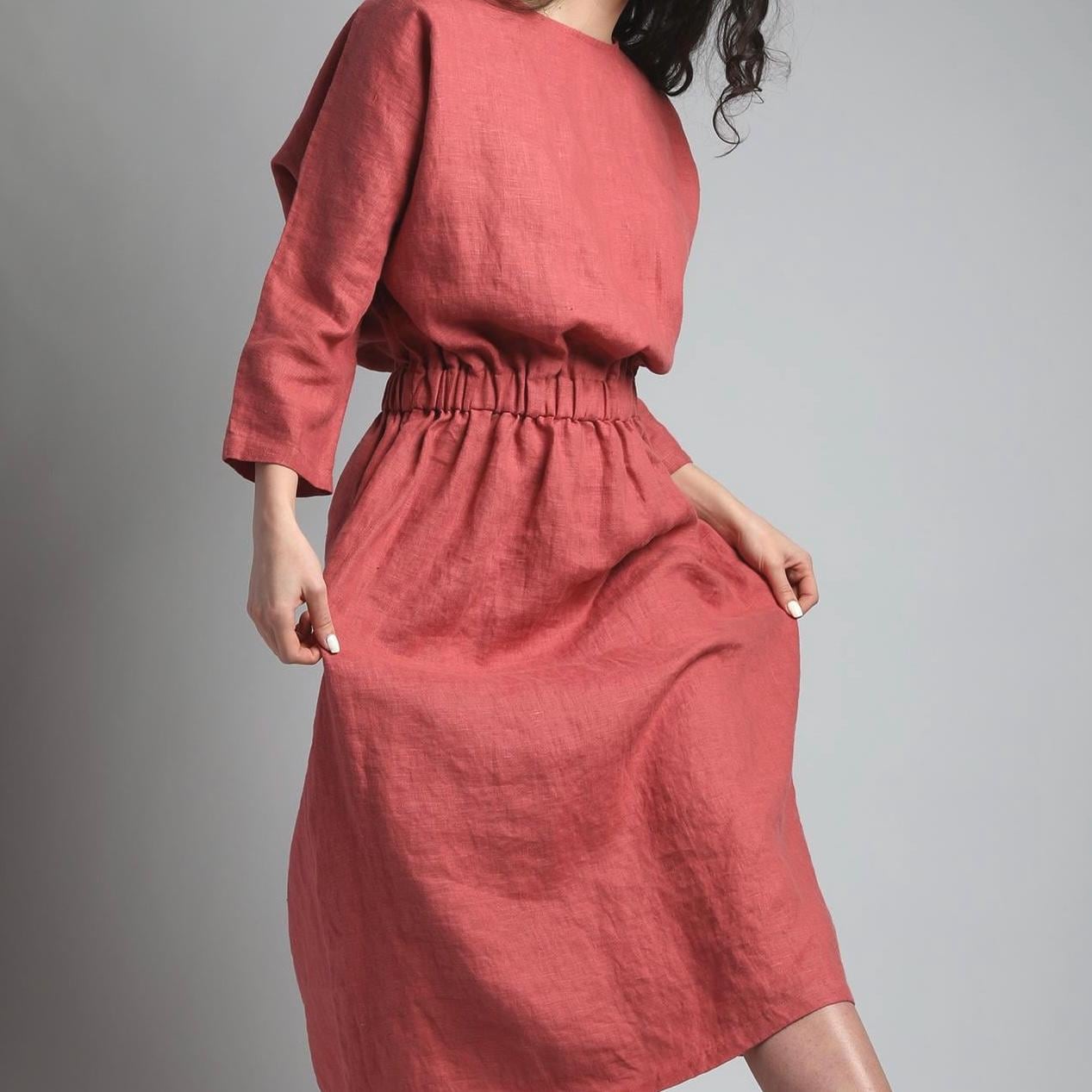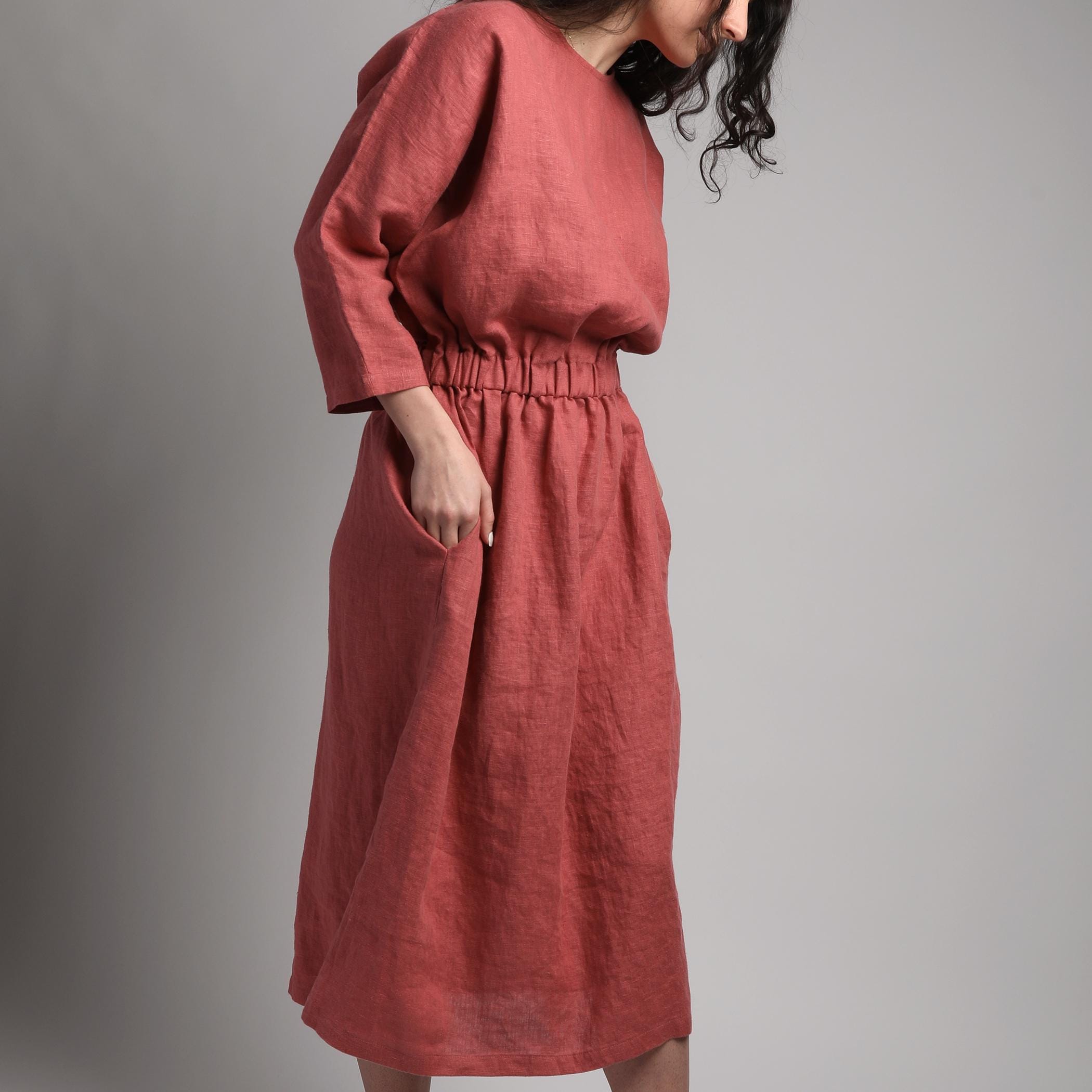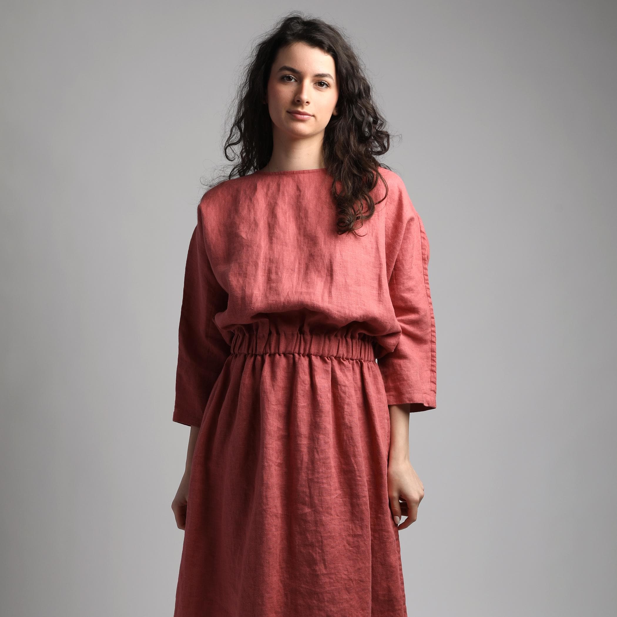 Step into effortless elegance with our handmade linen dress, crafted for those who appreciate timeless style and sustainable fashion. Made from high-quality Lithuanian linen, this boho-inspired piece features a cinched waist, simple lines, and a flowing silhouette, designed for both comfort and sophistication. Shown in color Red Grapefruit.